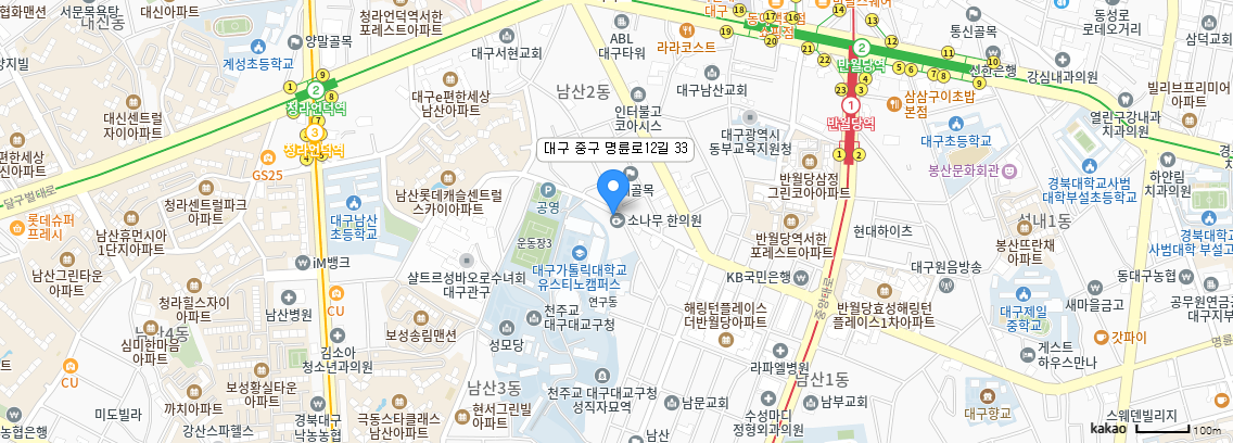 오시는 길 오시는 길 로드뷰길찾기 도로명 : 대구광역시 중구 명륜로 12길 33지 번 : 대구 중구 남산동 578-17위 치 : 반월당역 1번 출구에서 남문시장 사거리의 카톨릭신학대학 방면 1층 1호선 : 반월당역 1번 출구 > 도보 10분 거리2호선 : 반월당역 19번 출구 > 도보 10분 거리3호선 : 청라언덕역 7번 출구 > 도보 12분 거리 동구1 : 남산2동주민센터앞 도보 3분 거리, 남문시장건너 1번 정류장 도보 3분 거리동구1-1 : 남산2동주민센터건너 도보 3분 거리, 남문아파트앞 도보 3분 거리306, 349, 401, 405, 410-1, 503, 650, 805 : 반월당역(1번출구)1번 정류장 도보 6분 거리 주차료 (무료)한의원 앞 : 1~2대 가능 (불가능할 경우 근처 유료주차장 이용)남산향수길공영주차장 : 대구 중구 명륜로 12길 47※ 유료주차장 이용 시 진료 끝나고 주차장 영수증 보여주시면 주차비 지원해드립니다.